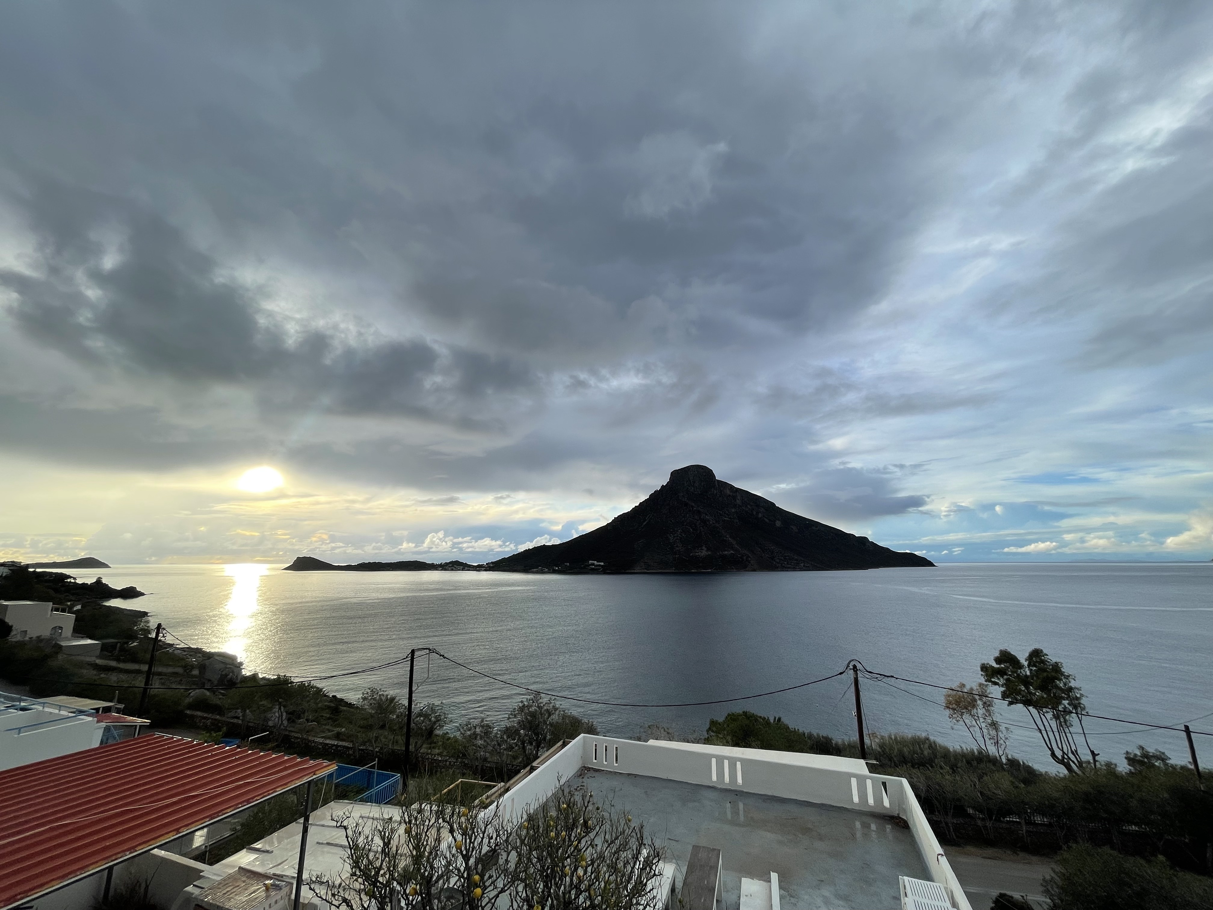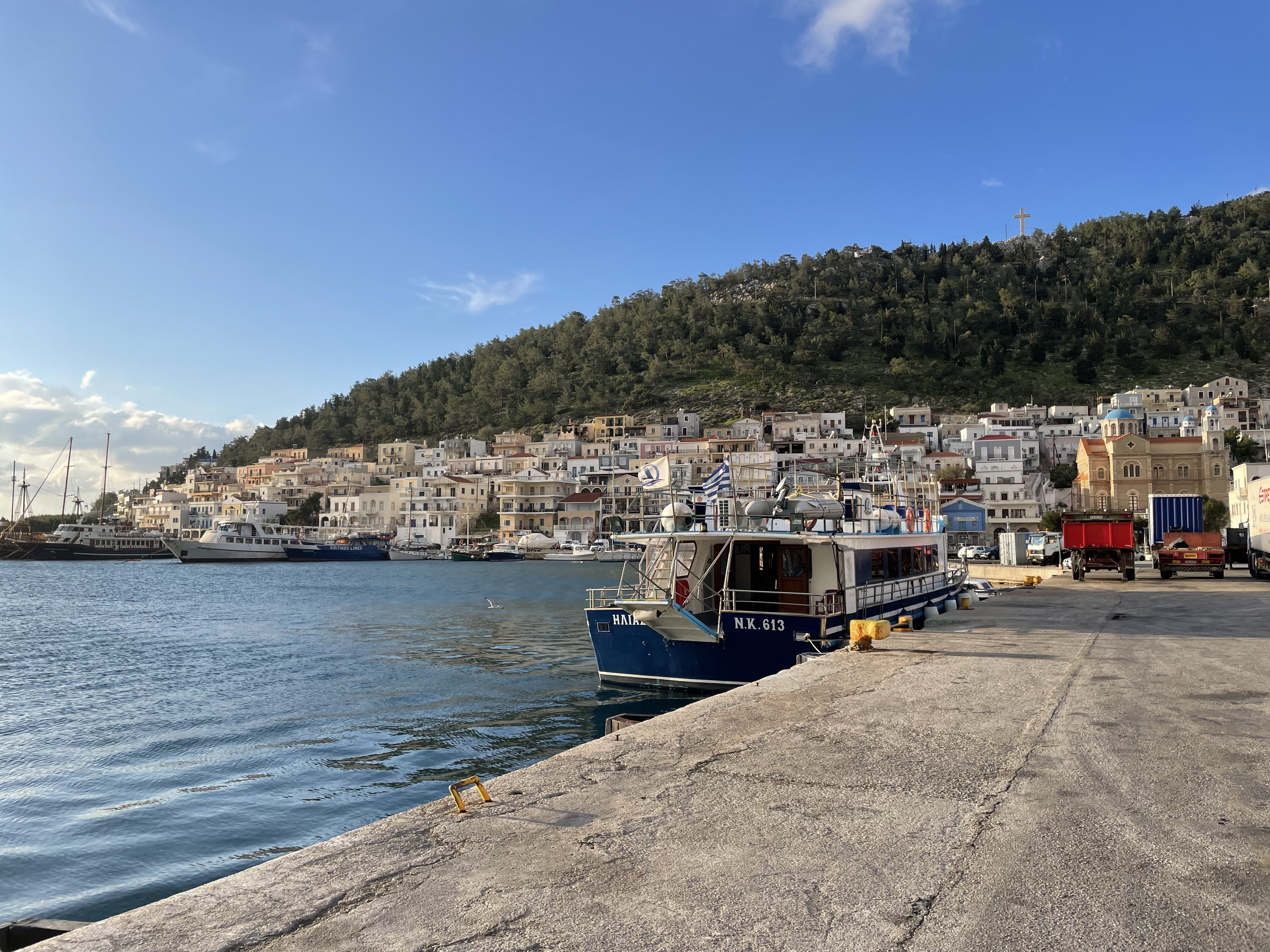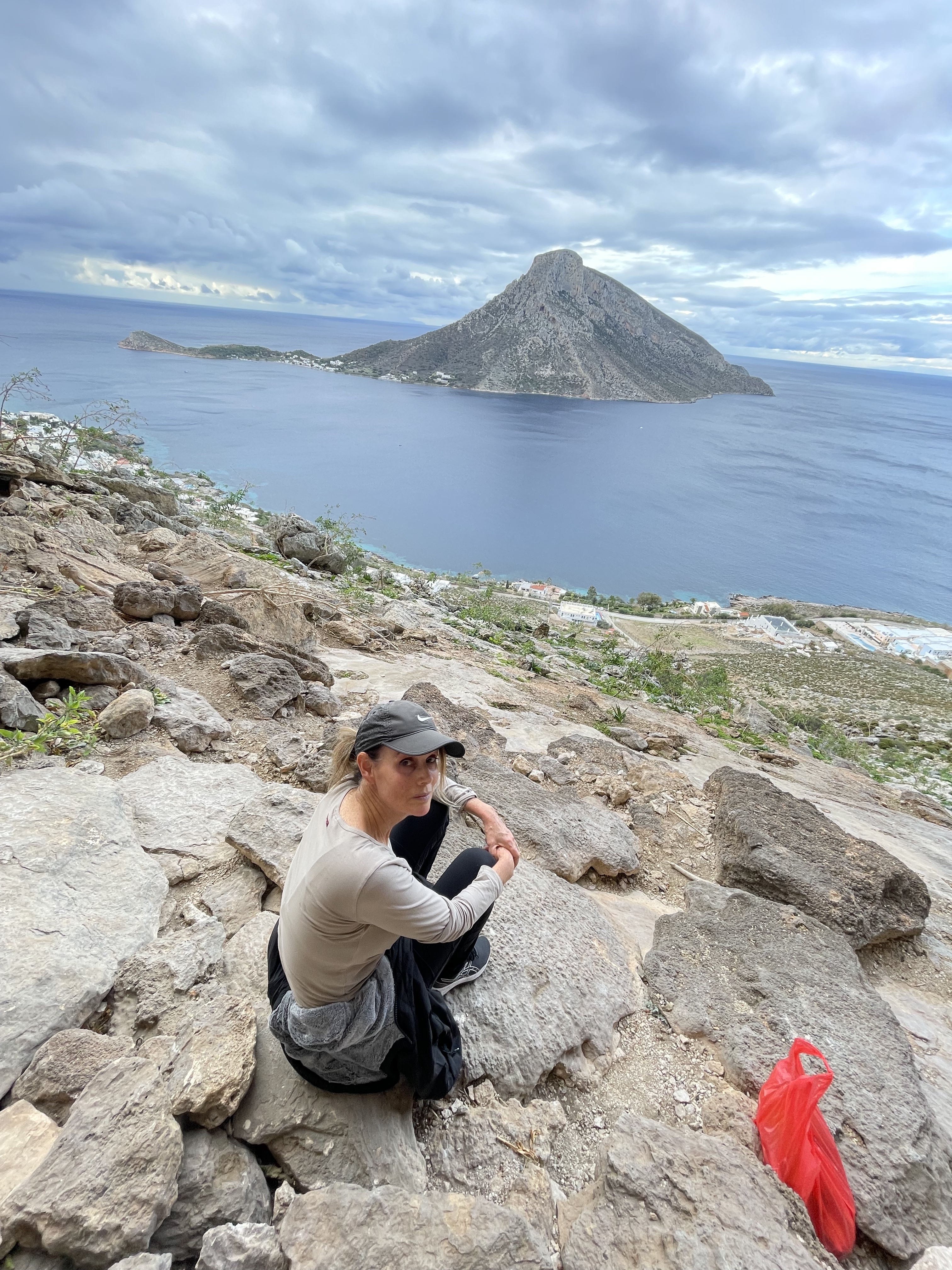 My mom sitting after an exhausting hike, my attempt at Alan's 6c+ Project, and the port of Kos.